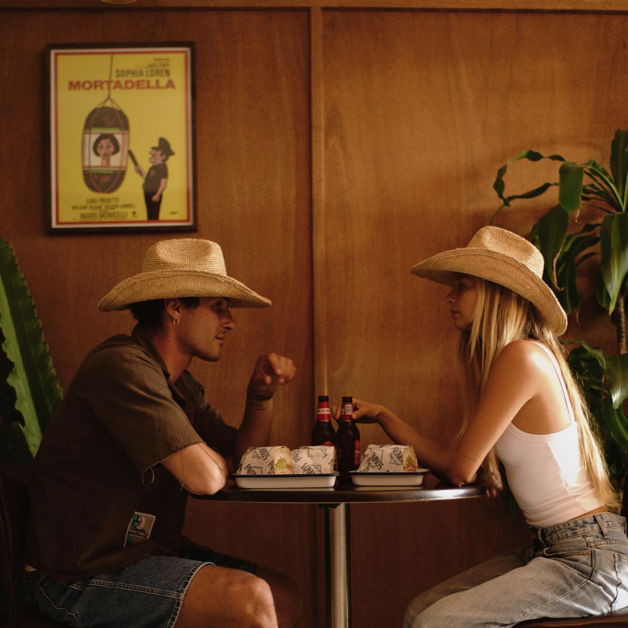 Two people wearing cowboy hats against a clear blue sky.