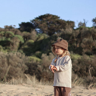 Introducing the Little Billie Brown string bucket hat. Featuring a unique removable chin string system, it allows children to wear it your loose or secure it on little heads for windy days.